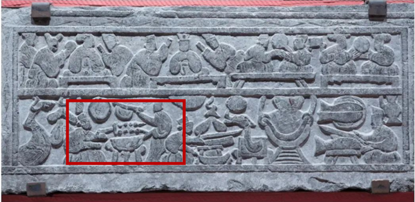 山东临沂五里堡汉画像石《庖厨图》,有一人烧烤,一人持扇扇风